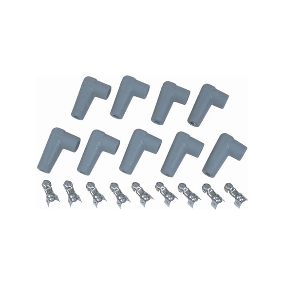 MSD replacement plug wire boot and terminal kits are perfect for enthusiasts who build their own wire sets or need to replace damaged boots. The boots are made from a high-temperature silicone compound and feature a gray finish. The terminals have large crimp tabs to grasp the wire, and wide contacts to grip the distributor cap receptacle.