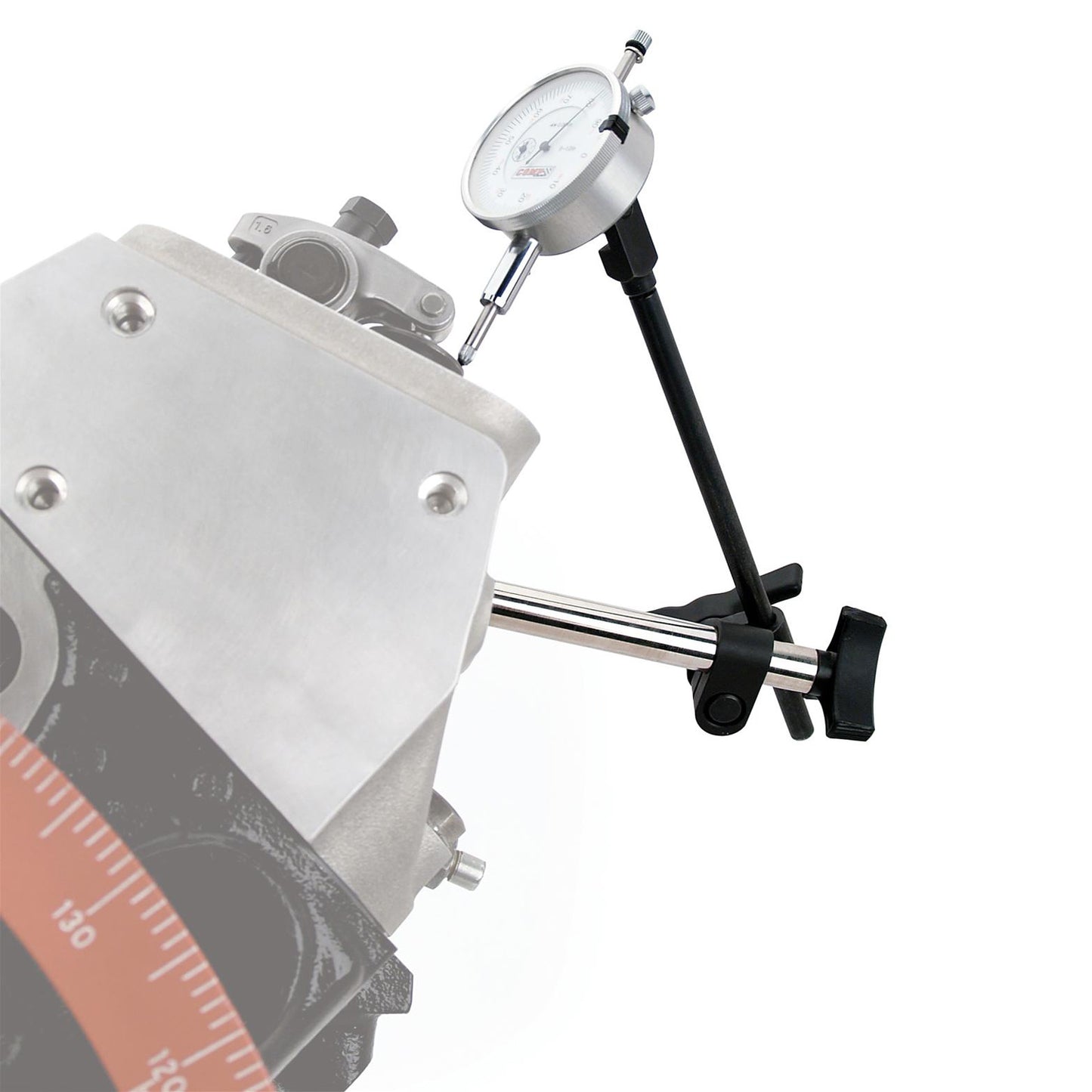 COMP Cams offers two styles of cam checking fixtures--heads on and heads off--to suit your automotive needs. The cylinder heads' off-engine fixtures were designed to maintain proper geometry, while holding a dial indicator (not included) and a 5 in. extension (included) precisely over the lifters. These professional quality tools are much easier to use and more precise than using a magnetic indicator base when degreeing a cam. These multi-functional tools can also be used to check rocker ratio, piston to valve clearance, and even crankshaft end play.