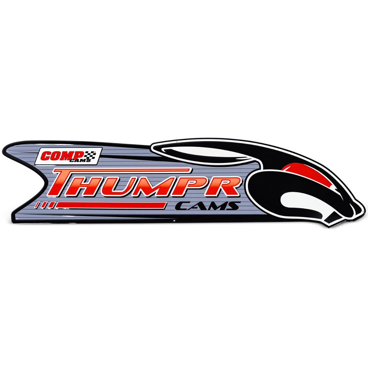 Nothing says Thumpr like a hot rod with zoomies! Whether you have a COMP Cams Thumpr camshaft or not, every garage wall will look better with this 33"x10" retro-looking embossed sign made of .024 aluminum. The cut-to-shape, full-color graphics feature the Thumpr rabbit head logo with a vintage channeled hot rod parked in front of it. The orange hot rod features a set-back engine with quad intake, zoomies, and pie-cutters on the rear! It doesn't get any better, but your wall will with the new Thumpr sign hanging on it!