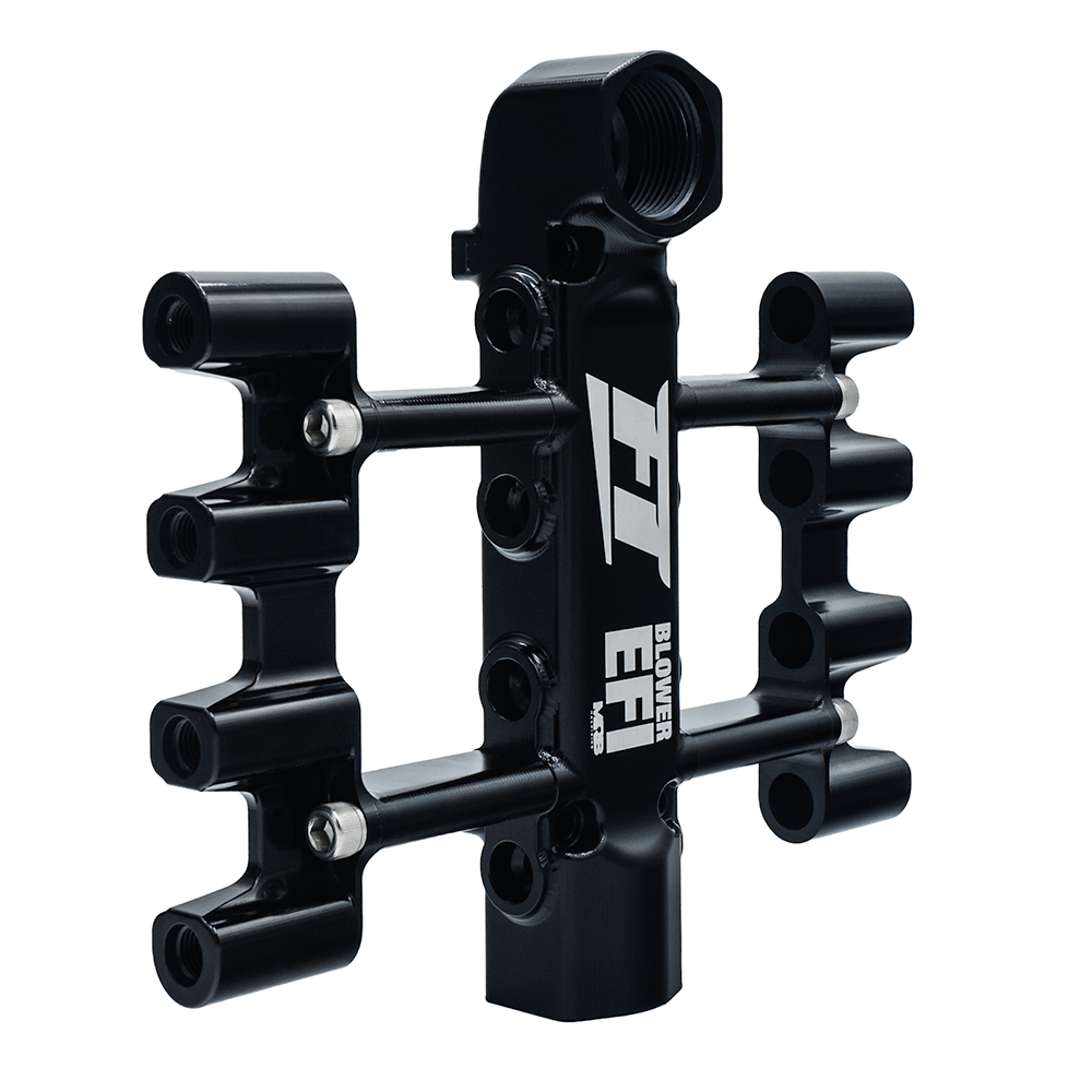 FuelTechÕs FT Blower EFI Injector Manifold is engineered for precision fuel delivery in screw or roots blowers, accommodating 8 fuel injectors for optimal performance. This injector manifold allows targeted fuel injection directly into the blower hat, enabling precise control over each injectorÕs spray zone or spray bar.