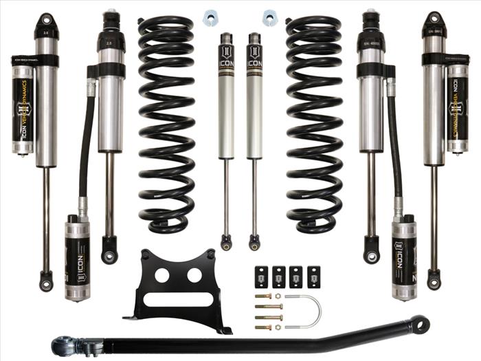 The ICON 2.5Ó suspension system is a great way to level your 4WD 2005-2016 Ford F250/350 Super Duty while improving ride quality and performance. This Stage 5 system is great for towing, rough construction site terrains, and country dirt roads all while keeping a smooth highway feel. Also included in this stage is ICON's CDC Valve front to back for those desiring an easy way to tune the ride externally with 10 settings from soft to hard. ICON's Stage 5 System is comprised of dual rate coil springs, alignment cams for adding caster, adjustable track bar w/ bearing, dual steering stabilizer kit with ICON 2.0 Aluminum Series stabilizers, and ICON 2.5 Aluminum Series remote reservoir shocks front and rear w/ CDCV. ICON 2.5" reservoir shocks ensure optimum performance by increasing the duration of consistent damping regardless of situation, keeping the shocks at a cooler operating temperature during heavy use. With the endless hours ICON has spent testing and tuning our suspension components and shocks as a complete package, you can rest assured you have the best suspension solution on the market.