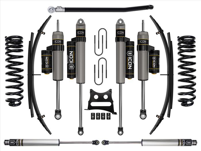 The ICON 2.5Ó suspension system is a great way to lift your 4WD 2008-2010 Ford F-250/F-350 Super Duty while improving ride quality and performance. This upgraded Stage 4 system is great for towing, rough construction site terrains, and country dirt roads all while keeping a smooth highway feel. ICON's Stage 4 System is comprised of dual rate coil springs, 2.5 Aluminum Series piggyback reservoir front and rear shocks, adjustable front track bar with massive FK rod end, alignment cams for adding caster, dual steering stabilizer kit with ICON 2.0 Aluminum Series stabilizers, and rear leaf spring expansion packs with blocks and U-bolts for a more compliant ride and reduced axle wrap. ICON 2.5" piggyback reservoir shocks ensure optimum performance by increasing the duration of consistent damping regardless of situation, keeping the shocks at a cooler operating temperature during heavy use. With the endless hours ICON has spent testing and tuning our suspension components and shocks as a complete package, you can rest assured you have the best suspension solution on the market.