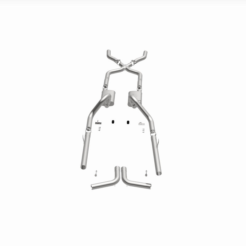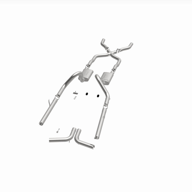 The MagnaFlow 1955-1957 Chevrolet Bel Air Street Series Crossmember-Back Performance Exhaust System brings enhanced engine sound and dyno-proven performance to your 4.3L, 4.6L 1955-1957 Chevrolet Bel Air with a healthy helping of our deep, resonant signature exhaust note at Aggressive exterior and Moderate interior sound levels. Thanks to its durable, corrosion resistant stainless steel design, this Chevrolet Bel Air exhaust system will handle whatever tarmac you decide to leave your mark on. This performance exhaust kit features a crossmember-back layout designed to replace your Chevrolet Bel Air's exhaust system from the crossmember on back. With its fast-flowing, mandrel bent 3in. main piping and 2 Straight-Through mufflers ending in a Multiple Exit Options exit that you can enhance with tips of your choosing, your muscle car will be sounding as awesome as it looks. Extensive 3D scanning during development has resulted in a direct-fit design that you can easily install yourself. 16596 is produced using CNC precision robotic manufacturing techniques and is backed by MagnaFlow's limited lifetime construction warranty.