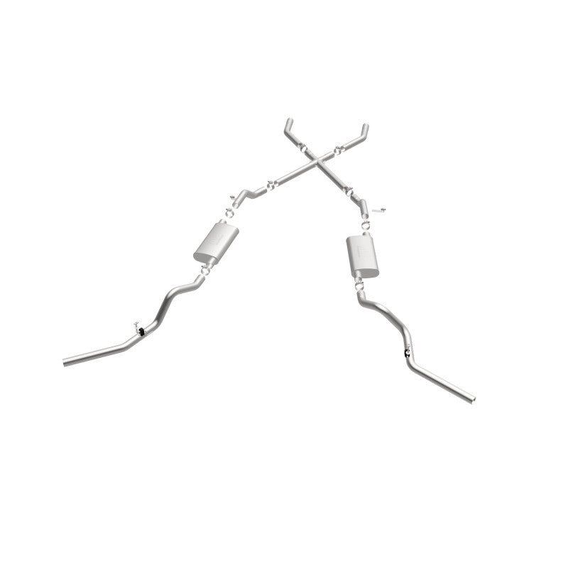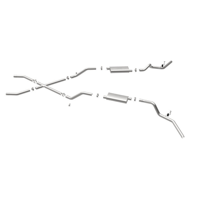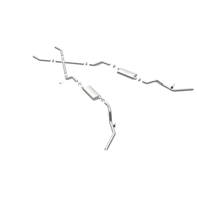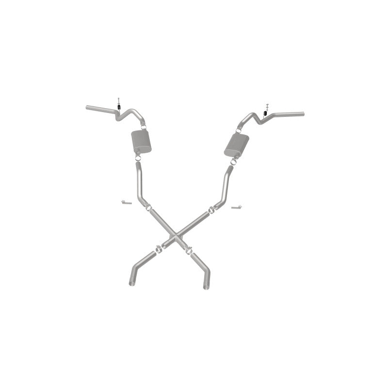 The MagnaFlow Street Series Crossmember-Back Performance Exhaust System 16643 brings enhanced engine sound and dyno-proven performance to your 3.8L, 4.1L, 4.3L, 4.6L, 4.8L, 5.0L, 5.3L, 5.7L, 6.5L, 6.6L 1960-1972 Chevrolet with a healthy helping of our deep, resonant signature exhaust note at Aggressive exterior and Moderate interior sound levels. Thanks to its durable, corrosion resistant stainless steel design, this Chevrolet exhaust system will handle whatever tarmac you decide to leave your mark on. This performance exhaust kit features a crossmember-back layout designed to replace your Chevrolet's exhaust system from the crossmember on back. With its fast-flowing, mandrel bent 2.5in. main piping and 2 Straight-Through mufflers ending in a Dual Split Rear Behind Rear Tires exit that you can enhance with tips of your choosing, your muscle car will be sounding as awesome as it looks. Extensive 3D scanning during development has resulted in a direct-fit design that you can easily install yourself. 16643 is produced using CNC precision robotic manufacturing techniques and is backed by MagnaFlow's limited lifetime construction warranty.