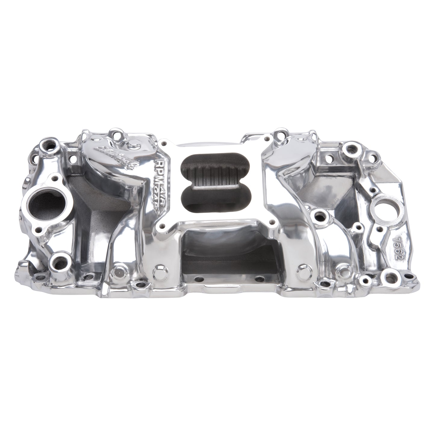 The Edelbrock RPM Air-Gap 2-R #75621 intake manifold is designed for street 396-502 c.i.d. Chevrolet V8's with high-performance rectangular-port heads, the RPM Air-Gap incorporates our race-winning technology. The open air space separates the runners from the hot engine oil, and as a result, the air/fuel mixture stays cooler for a denser charge and more power. The RPM Air-Gap 2-R #75621 intake manifold is a dual-plane, high-rise design with a 180-degree firing order to produce incredible top-end horsepower while retaining good throttle response. The larger plenum and runners match the free-flowing exhaust, high-lift cams and other modifications of a high output engine. They are intended for high-performance street or competition engines that run up to 6500 rpm. Includes rear water outlets, two distributor clamp locations and nitrous bosses. Accepts all late model alternator and A/C brackets for the street. For square-bore carbs only. No provision for exhaust heated chokes and no exhaust crossover. The Edelbrock RPM Air-Gap 2-R #75621 also features a polished aluminum finish for a brilliant shine and classic look. For the ultimate "Made in USA" quality, every Edelbrock intake manifold is cast and machined in the USA.