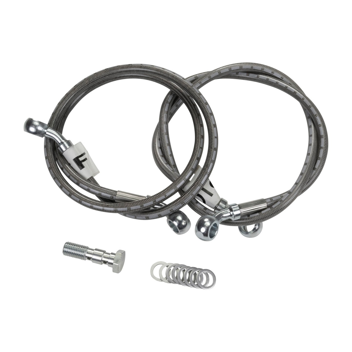 Russell's Cycleflex Two-Line Racer Kits utilize a PTFE inner liner supported by a stainless steel outer jacketing to eliminate brake hose expansion for a firm brake lever time after time. These kits consist of two brake hoses that connect directly to the master cylinder using a double length banjo bolt (supplied as necessary), with the longer hose attaching to the left caliper, shorter to the right caliper. This eliminates the OEM three hose set-up and brake junction making brake service at the track simpler and improving brake performance. All two line racer kits come with extruded clear coat to protect against abrasion of painted surfaces. Cycleflex Two-Line Racer Kits meet all the guidelines of the D.O.T. MVSS-571.106 requirements to deliver an extra margin of safety and are 50-state legal.