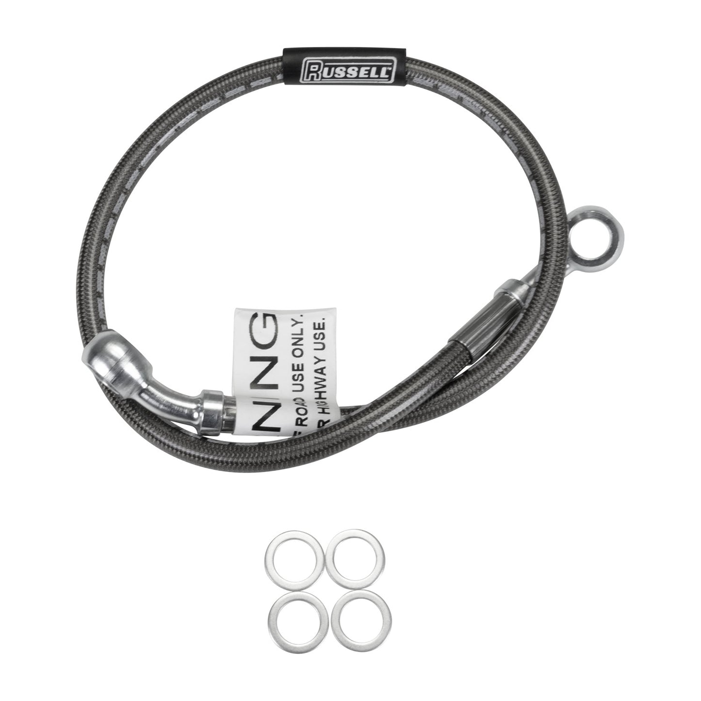 Russell's Cycleflex Two-Line Racer Kits utilize a PTFE inner liner supported by a stainless steel outer jacketing to eliminate brake hose expansion for a firm brake lever time after time. These kits consist of two brake hoses that connect directly to the master cylinder using a double length banjo bolt (supplied as necessary), with the longer hose attaching to the left caliper, shorter to the right caliper. This eliminates the OEM three hose set-up and brake junction making brake service at the track simpler and improving brake performance. All two line racer kits come with extruded clear coat to protect against abrasion of painted surfaces. Cycleflex Two-Line Racer Kits meet all the guidelines of the D.O.T. MVSS-571.106 requirements to deliver an extra margin of safety and are 50-state legal.